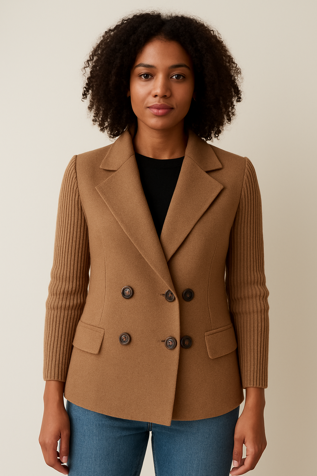 La Giacca Vittoria unisce lo stile classico del doppiopetto alla morbidezza del tessuto caldo e avvolgente. Le maniche lavorate a maglia aggiungono un tocco moderno e ricercato, perfetto per la mezza stagione. Il taglio sagomato esalta la figura con naturale armonia, mentre il colore neutro si abbina facilmente a ogni abbigliamento. Un capo versatile e raffinato, pensato per chi ama distinguersi con semplicità e gusto.